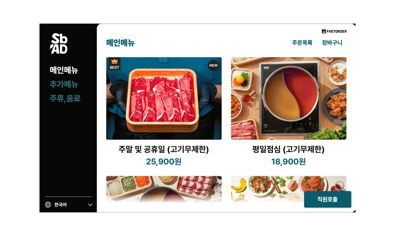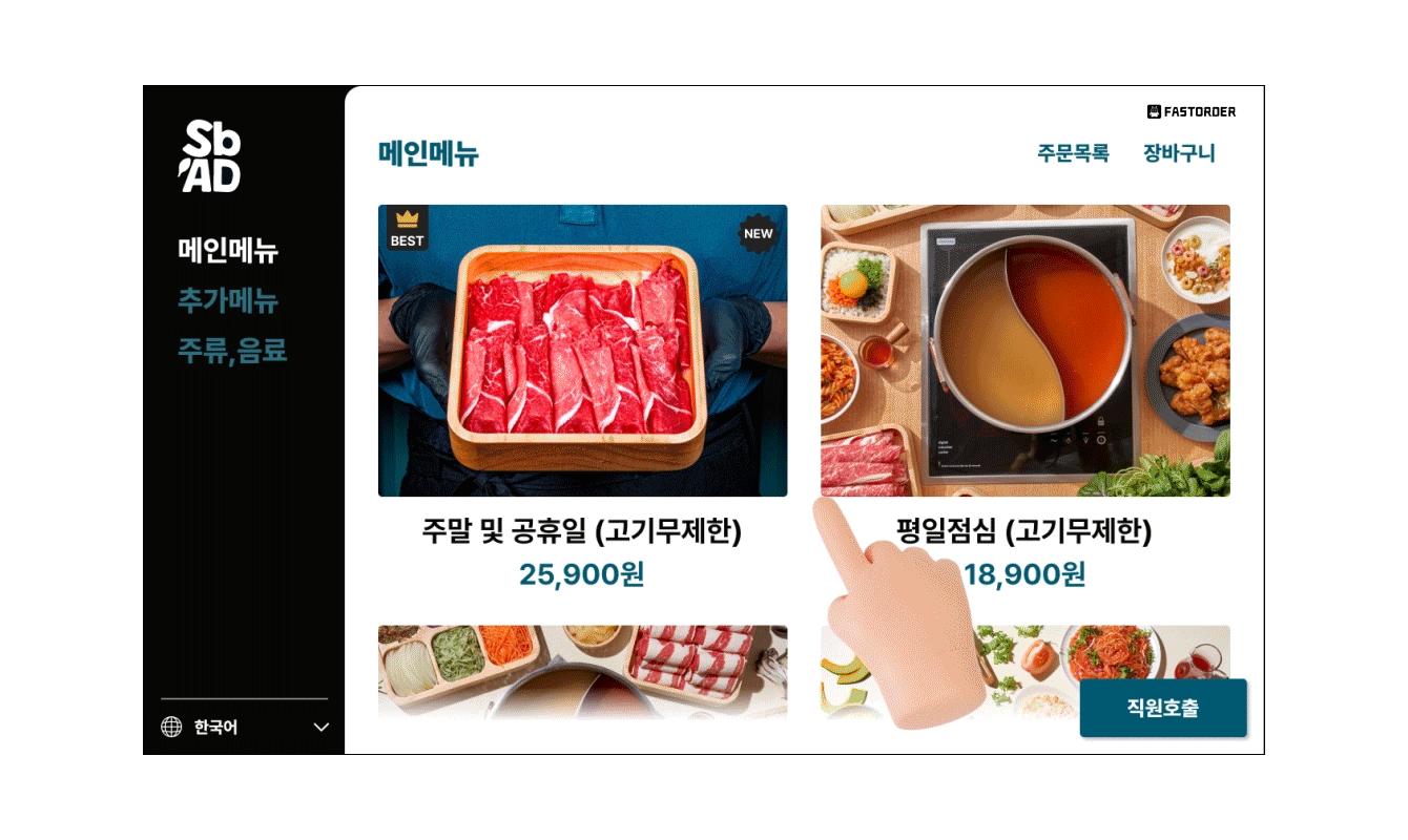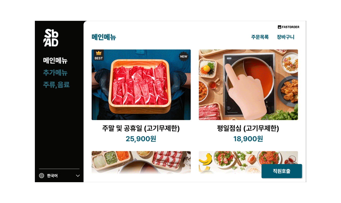 상품 주문 외 직원의 도움이 필요한 경우 직원호출을 통해 서비스요청을 할 수 있습니다.